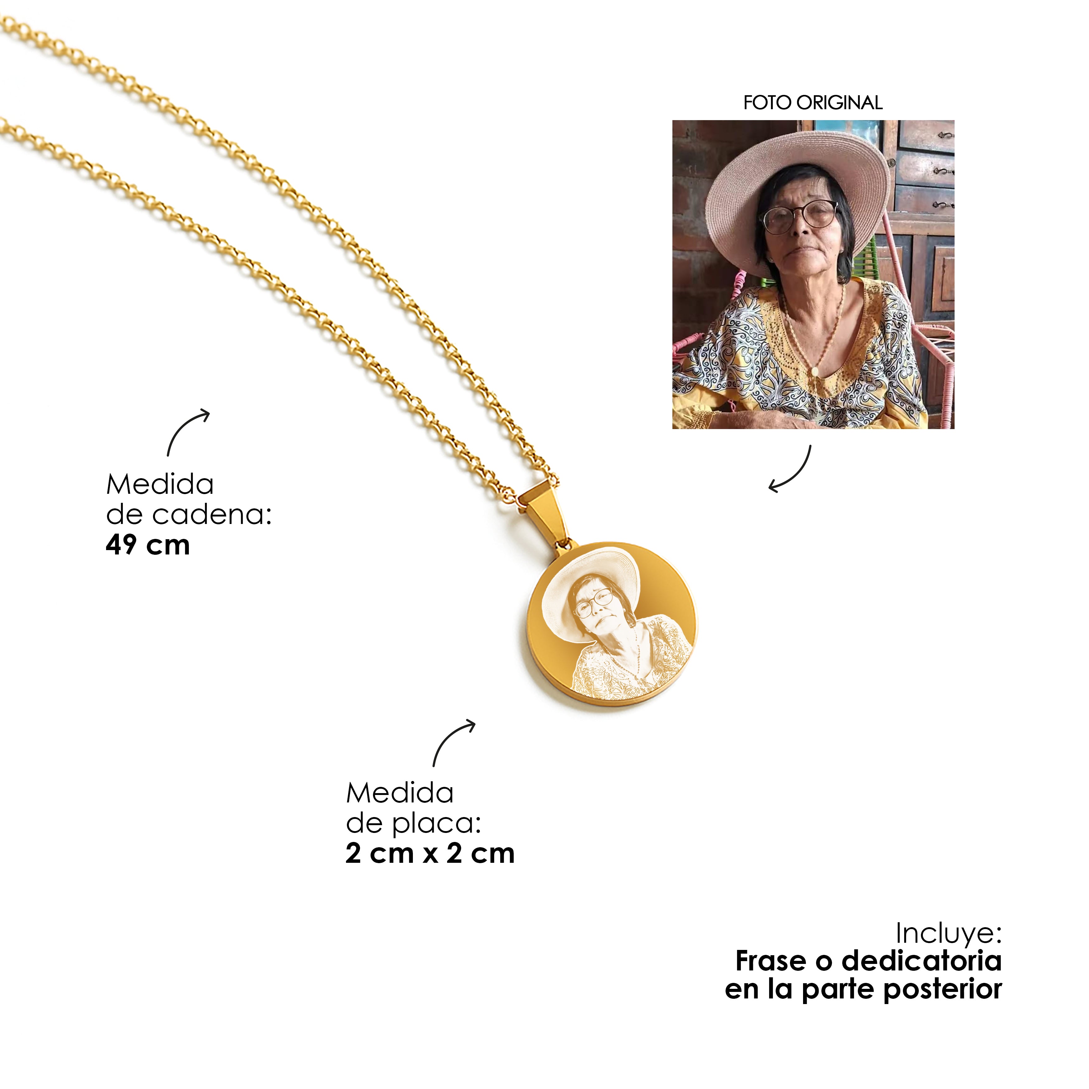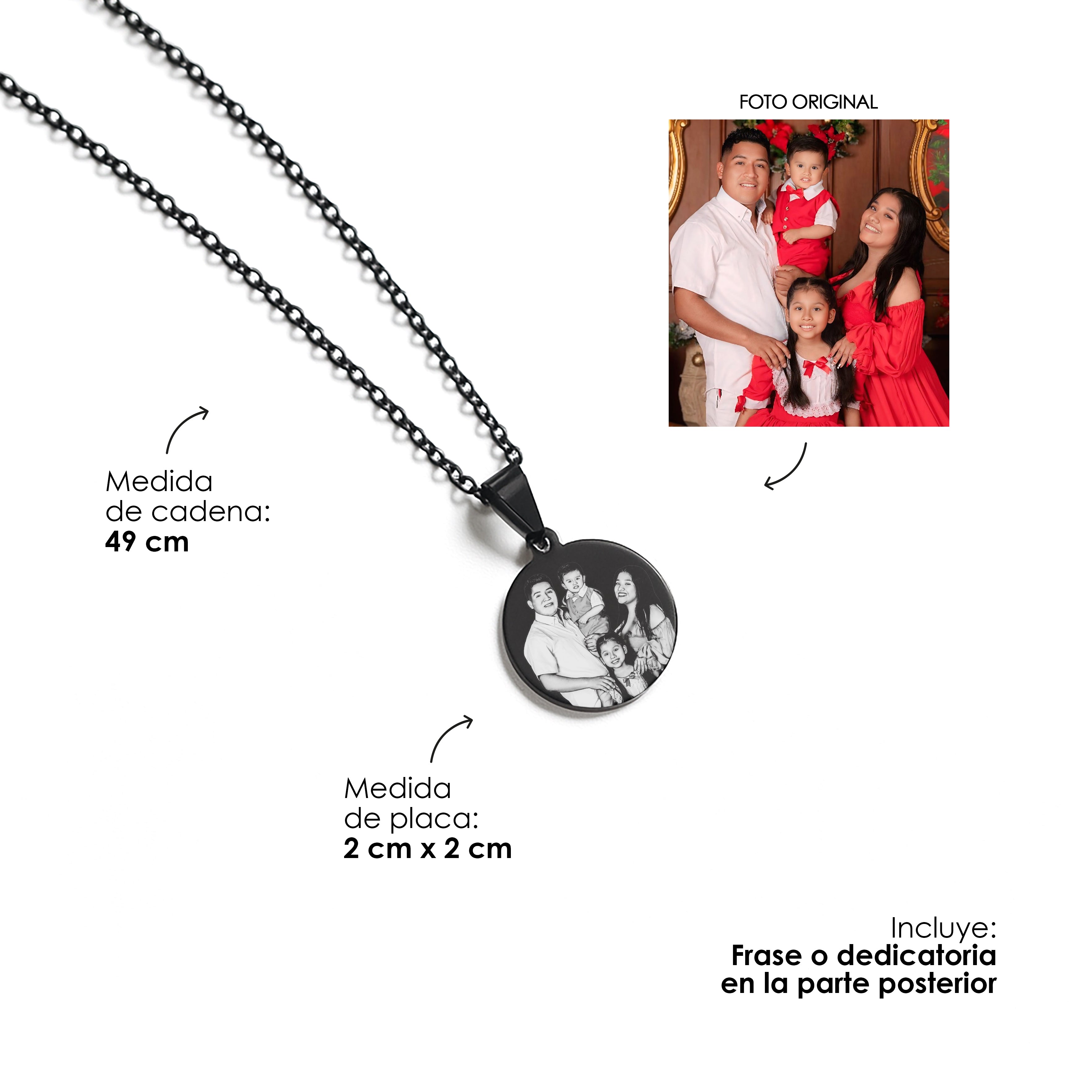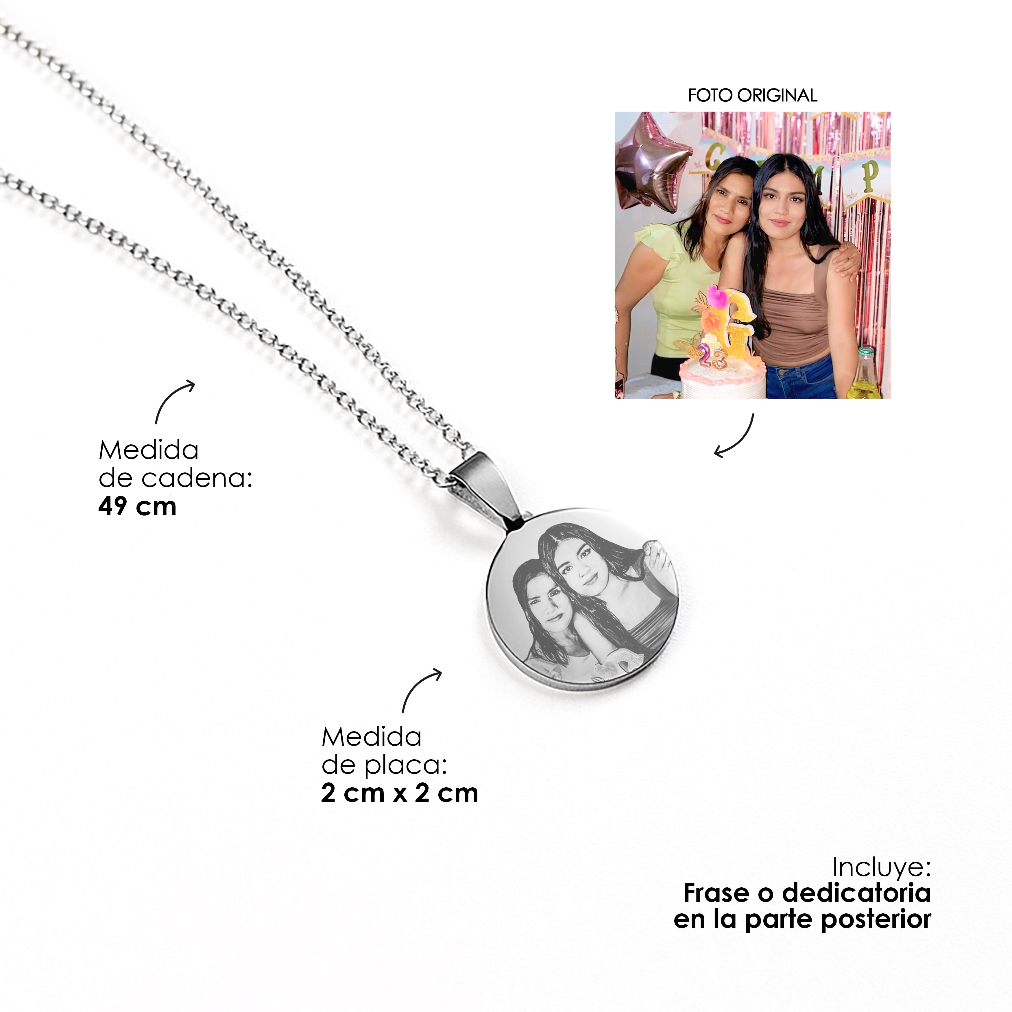 1 cadena para dama + dije + grabado láser en ambas caras + empaque listo para obsequiar.