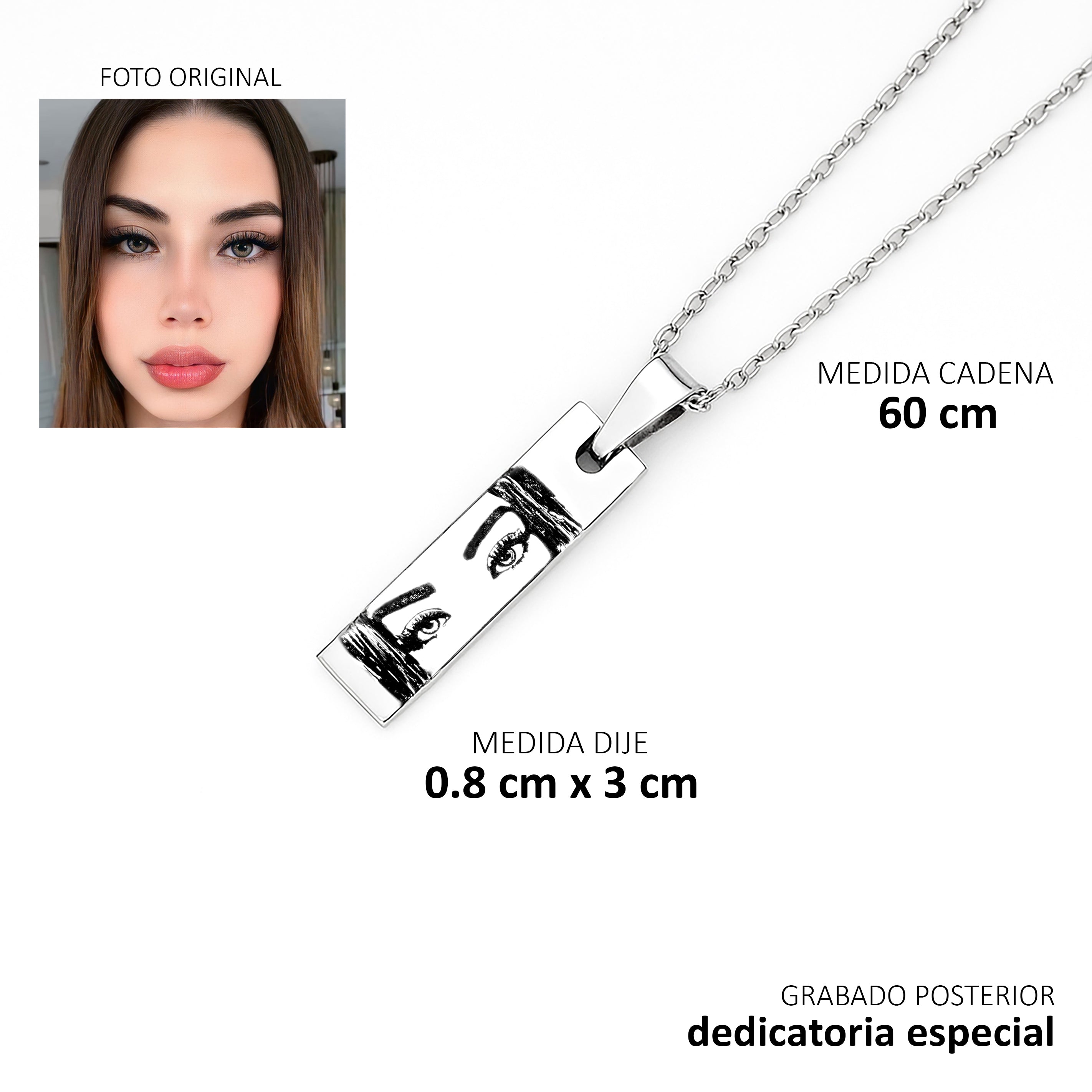 Lleva contigo una mirada que lo dice todo. Este collar en plata 925 de alta calidad está diseñado con un dije rectangular que captura, mediante un fino grabado, los ojos de una persona especial a partir de una fotografía real. Cada línea es cuidadosamente trabajada para reflejar expresividad y detalle, convirtiéndose en una joya única y significativa.